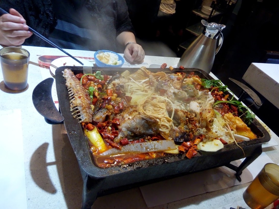 Durante el viaje, por supuesto seguí disfrutando de buena comida, muy lejos de la que se nos ofrece en los restaurantes chinos en España, como este pescado picante de Sichuan (provincia china del interior que destaca por las guindillas y la comida super picante) o el marisco de esa provincia. Pero al desplazarme al norte, aunque la comida sigue siendo fantástica, como se puede ver en esta última fotografía, las verduras y las aves como la gallina o el pato (que se sirve al modo pequinés con una salsa de soja espectacular y con la piel bien crujiente con tortitas de arroz como se puede ver) reemplazan al marisco y la pasta de arroz de los «dampling».
