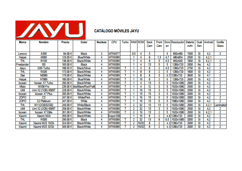 Como veréis, y siempre según los técnicos de Jayu, los principales elementos a destacar en su análisis son el procesador (todos Quad Core, pero hay algunos Turbo, marcados con la T final del procesador) RAM y ROM disponible, cámaras frontales y trasera, tamaño de pantalla y resolución de la misma, además de batería y Sistema Operativo, porque son los aspectos que marcan el futuro funcionamiento del terminal o smarthpone.