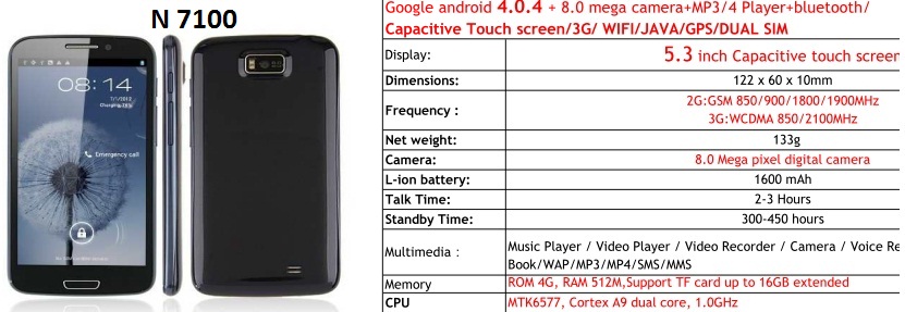 * Terminal libre N7100 pantalla 5,3″ procesador Cortex A9 Dual Core 2x1GHz muy parecido al nuevo terminal de notas de Samsung, por sólo 135€ según cantidades.